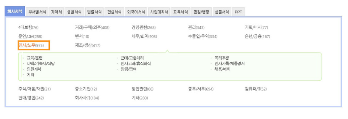 그 다음으로 인사/노무 카테고리를 클릭하시면 여러 양식을 보실 수 있습니다. 양식들 중에서 밑으로 조금만 내려오면 권고사직서라는 양식이 있습니다. 이것을 누르고 다운 받으시면 됩니다.