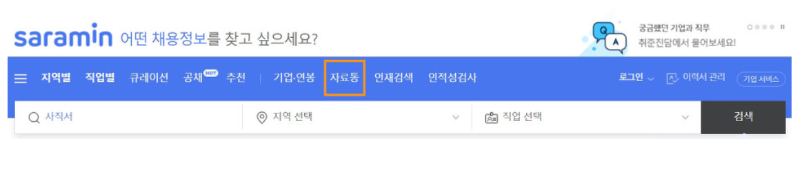 사람인 홈페이지 상단에 있는 메뉴 카테고리에서 자료통을 클릭합니다. 이 자료통 카테고리에 취업과 관련된 다양한 서류들이 대부분 있습니다.