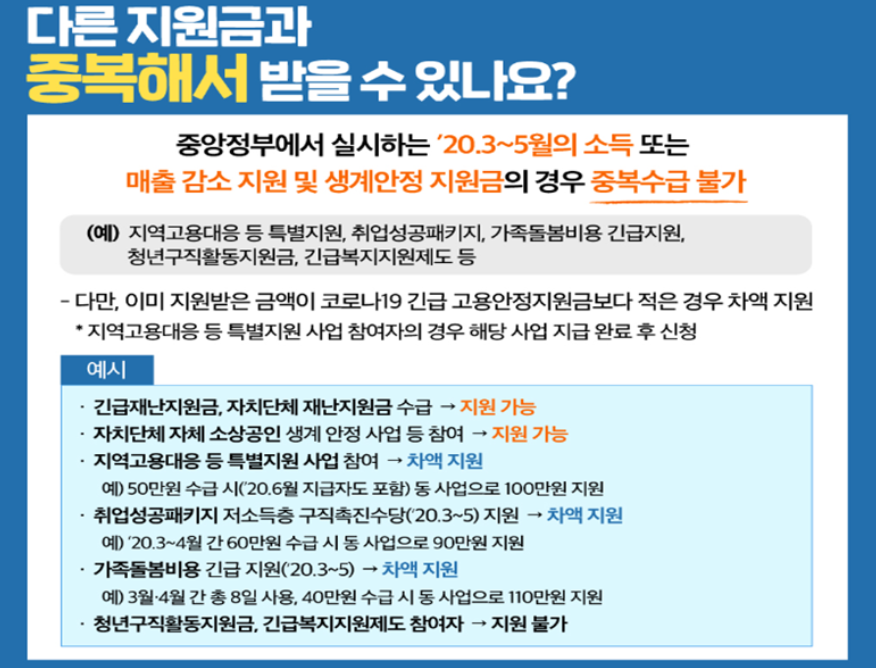 다만, 이 지원받았던 금액이 코로나19 긴급 고용안정지원금보다 적을 경우에는 지원이 가능합니다. 자세한 사항은 포스팅 하단 Q&A에서 한번 더 다루겠습니다.