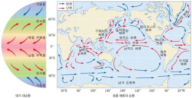 오늘 해류의 정의에 대해서 알아보겠습니다. 바다에서 일정한 방향과 속도를 갖는 해수 흐름을 해류라고 표현합니다. 이 해류의 역할은 대기의 순환과 함께 저위도의 열을 고위도로 수송해 주는것입니다. 해수 표층에서 흐르는 해류를 다시 표층 해류라고 표현합니다. 그리고 이 표층 해류는 대기 대순환에 영향을 받는 특징이 있습니다. 세계의 표층 해류는 모두 이와 같은 특징을 갖습니다. 이와 같은 표층 해류는 지구에서 부는 바람이 연중 일정한 방향으로 불끼 때문에 발생합니다. 예를 들면, 적도와 위도 30° 사이의 저위도에서는 무역풍이 불고 위도 30°와 60° 사이의 중위도에서는 편서풍이 불며 위도 60° 이상의 고위도에서는 동풍 계열의 극동풍이 붑니다. 바람에 의한 해류는 북적도 해류, 남적도 해류, 북태평양 해류, 남극 순환 해류, 북대서양 해류가 있습니다. 이 중 북적도 해류와 남적도 해류는 무역풍에 의해 동에서 서로 흐릅니다. 반면 북대서양 해류, 북태평양 해류, 남극 순환 해류는 편서풍의 영향으로 서에서 동으로 흐르는 특징을 가집니다. 저위도에서 고위도 쪽으로 흐르는 해류를 난류라고 표현합니다. 난류는 염분과 수온이 높은 반면 영양 염류와 용존 산소량이 적은 특징을 가집니다. 대표적인 해류로는 멕시코 만류, 브라질 해류, 동오스트레일이아 해류가 있습니다.