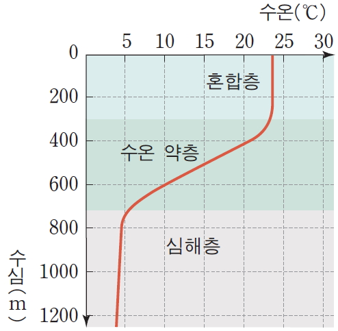 혼합층은 햇빛에 의해 표층이 가열된 후 바람에 의한 혼합 작용으로 깊이에 따른 수온 변화가 거의 없는 층이다. 수온 약층은 깊이에 따라 수온이 급격히 낮아지는 층으로, 하부의 물의 밀도가 상부의 물의 밀도보다 크므로 매우 안정하다. 그렇기때문에 심해층과 혼합층 사이의 물질과 에너지 교환을 차단한는 역할을 한다. 표층 수온이 높은 저위도 해역에서 뚜렷하게 나타나고, 고위도 해역에서는 거의 나타나지 않는다. 심해층은 연중 수온이 낮고 깊이에 따른 수온 변화가 거의 없는 층이다. 수온이 낮은 고위도 해역의 해수가 침강하여 형성된다. 수권의 역할은 태양 에너지를 저장하고, 물의 순환 과정을 통해 에너지를 지구 전체에 고르게 분산시키며, 지형의 변화와 생명 유지 활동에 관여한다.