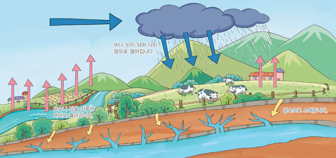 물은 지구계를 순환하면서 지권, 대기권, 수권, 생물권에 다양한 영향을 미치며 에너지를 고르게 분산시킵니다. 해양과 육지의 물은 태양 에너지에 의해 증발되거나 식물의 증산 작용을 거쳐 수증기의 형태로 대기로 이동합니다. 대기 중의 수증기는 기온과 습도 변화에 의해 응결되어 구름을 형성하며 비 혹은 눈이 되어 지표에 내린다. 지표에 강수로 내린 물은 하천수, 호수, 지하수가 되고 이는 결국 해양으로 이동하는데, 이 과정에서 지표의 모양은 다양하게 변하게 됩니다. 일부는 생물체에 흡수되었다가 다시 지표나 대기로 이동합니다. 더 깊이 파고들자면 물의 순환 과정과 물수지를 알아봐야 한다. 대기, 해양, 육지에서 각각 물의 유입량과 방출량은 같습니다. 이 이유는 각 영역에서 물수지 평형을 이루고 있기에 물의 양은 일정하게 유지됩니다.