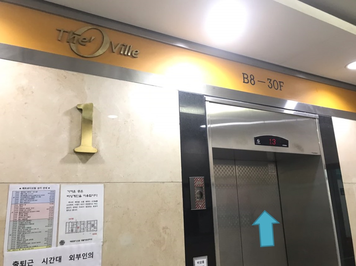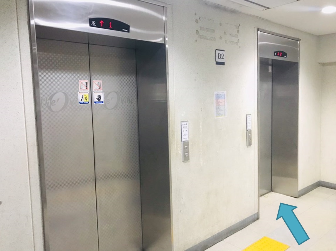 # 왼쪽에 두개의 엘레베이터가 보이는데, 화살표 표시된 엘레베이터를 탄다 / You see two elevators on the left, and you get on the elevator with the arrow on it.