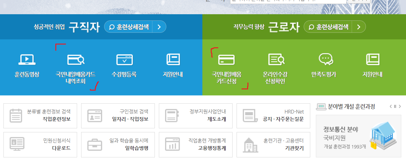 아래 신청방법이 나와있습니다. HRD-net 접속하셔서 순서대로 신청해보시고, 집주소 잘 기입하셔서 카드수령하시면 되는 프로세스입니다.