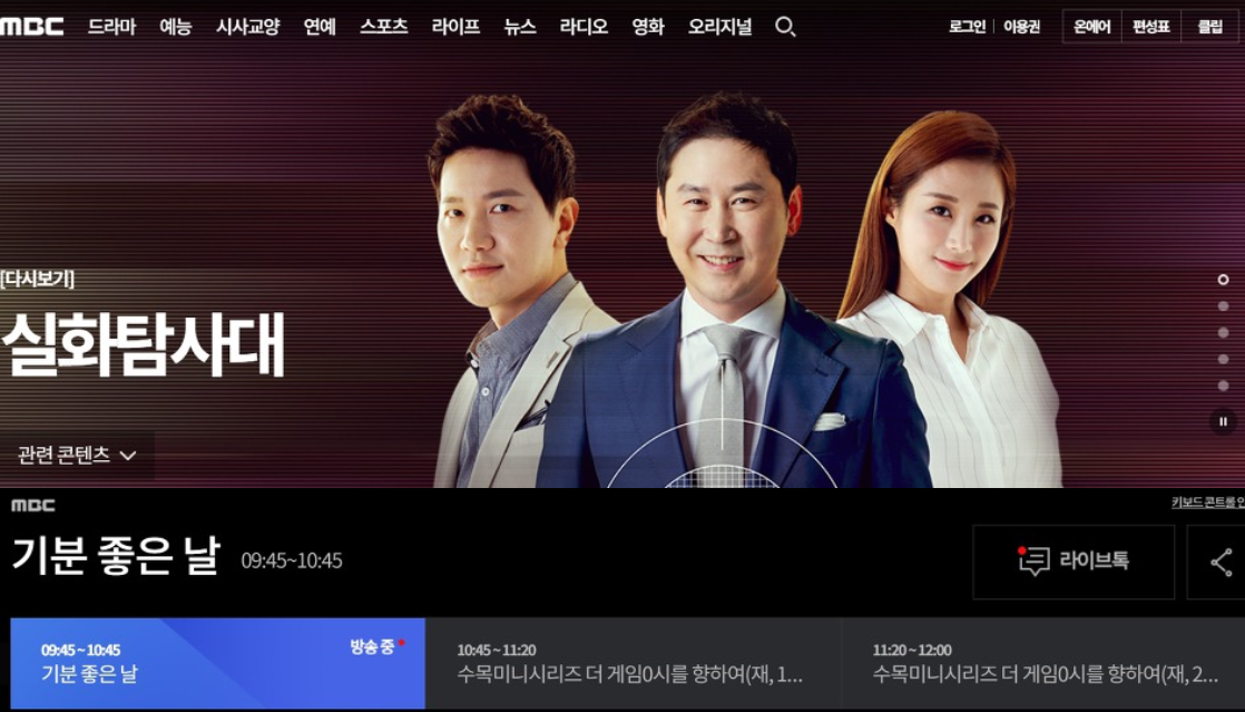 먼저 mbc와 sbs에 대해서 알아보겠습니다. 엠비씨에 홈페이지에 접속해서 오른쪽 상단을 보면 온에어라는 표시가 있습니다. 집에 티비가 없거나 인터넷으로 TV를 봐야하는 상황이라면 가장 먼저 온에어를 먼저 떠올리셔서 각 방송사 홈페이지에 접속하시면 됩니다.